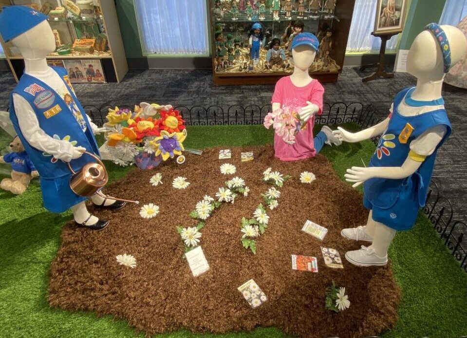 Daisy Girl Scouts were introduced to the Girl Scout Program levels in 1984. Initially designed for kindergarten or 5-year-old girls, the age levels were expanded to include 1st-grade girls. Our Daisies on display are gathered around the Daisy Garden to work on their Flower Garden Journey. Daisies earn petals for their vest or tunic as they learn about the Girl Scout Program. The petals and leaf badges they earn combine to make a complete Daisy on the uniform.