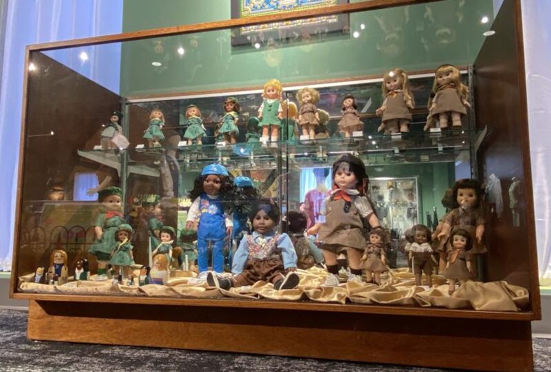 Dolls have long been a favorite toy for little girls, and the ones you see here, and scattered throughout the exhibit, capture Girl Scout history in miniature form. They wear a variety of uniforms from across the decades: some officially licensed, others lovingly homemade. One notable example is the Madame Alexander doll, the first doll on the top left shelf. It was produced without permission from GSUSA and was quickly recalled, making it a rare find today.