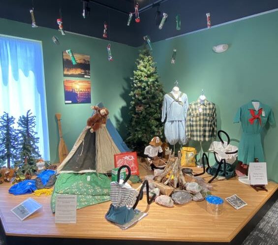 The camping area depicts a campfire with girls roasting marshmallows for s'mores, a tent from the 1960s, and several other camping items. This sleeping bag was available in the 1970s. The flashlights suspended above are from different years.