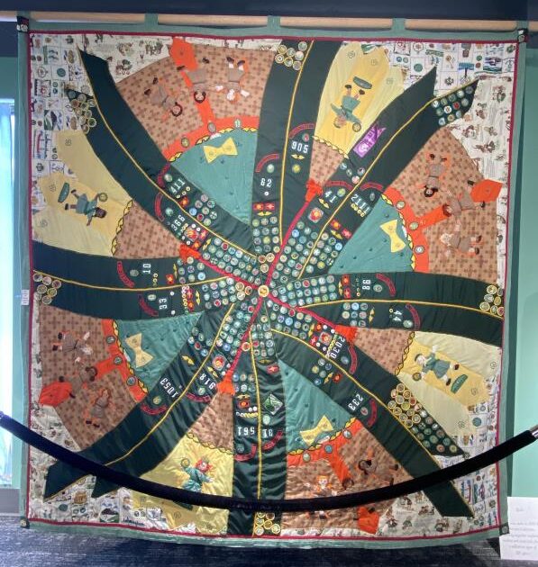 This quilt was made by artist and Girl Scout Collector Merana Cadorette in 2013, using reclaimed badge sashes and uniform pieces. The quilt contains over 20 years of uniform variations. Having collected an abundance of sashes, Merana decided to make this intricate quilt. Being from Florida, she chose a center spiral like a hurricane and then filled the in-between spaces with discarded uniform fronts.